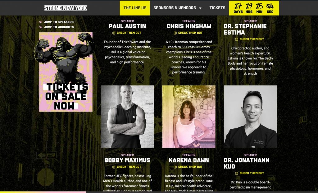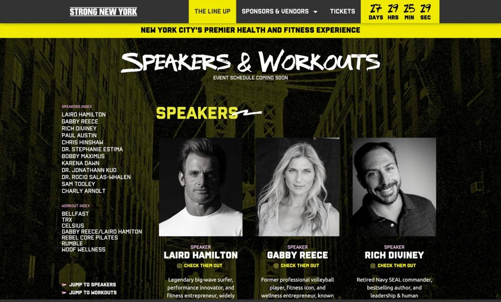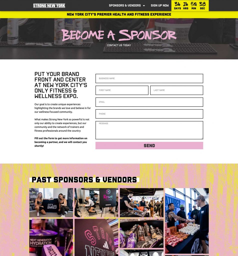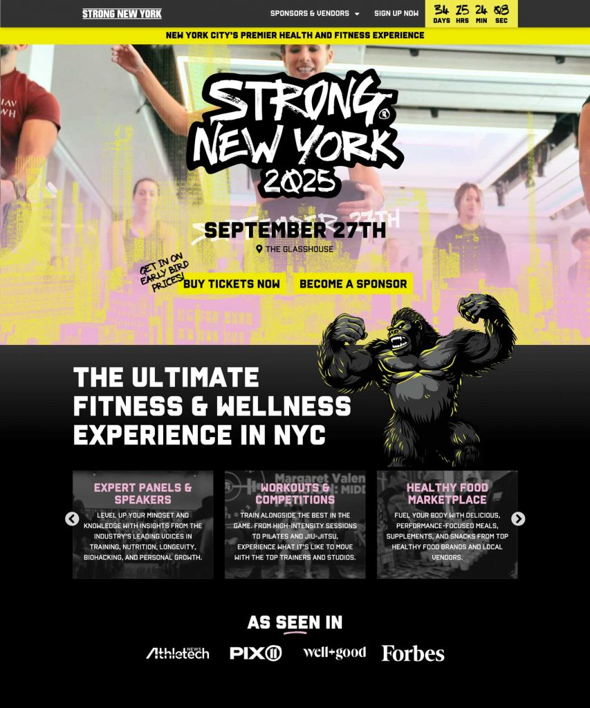 This is a website promoting the Strong New York 2025 Fitness & Wellness expo.
